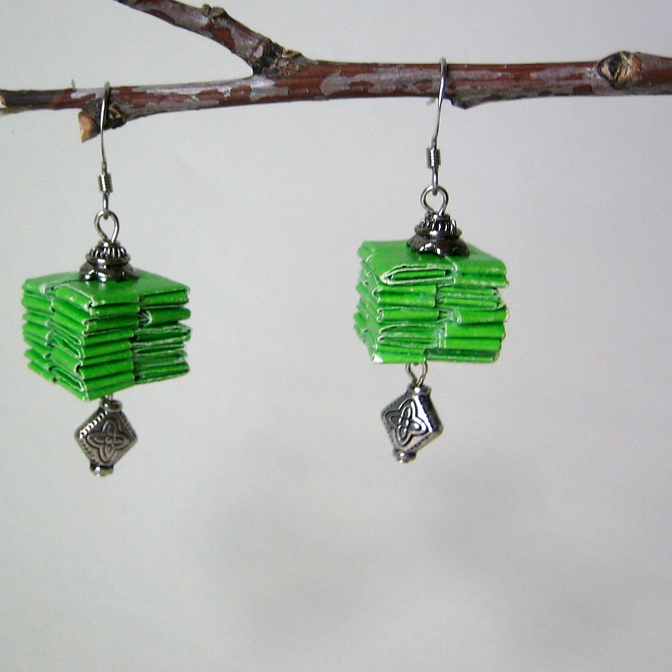 These earrings are made by hand with rescued almost neon green wrapping paper. This paper lived in a dark closet until it was freed and wrapped a gift.