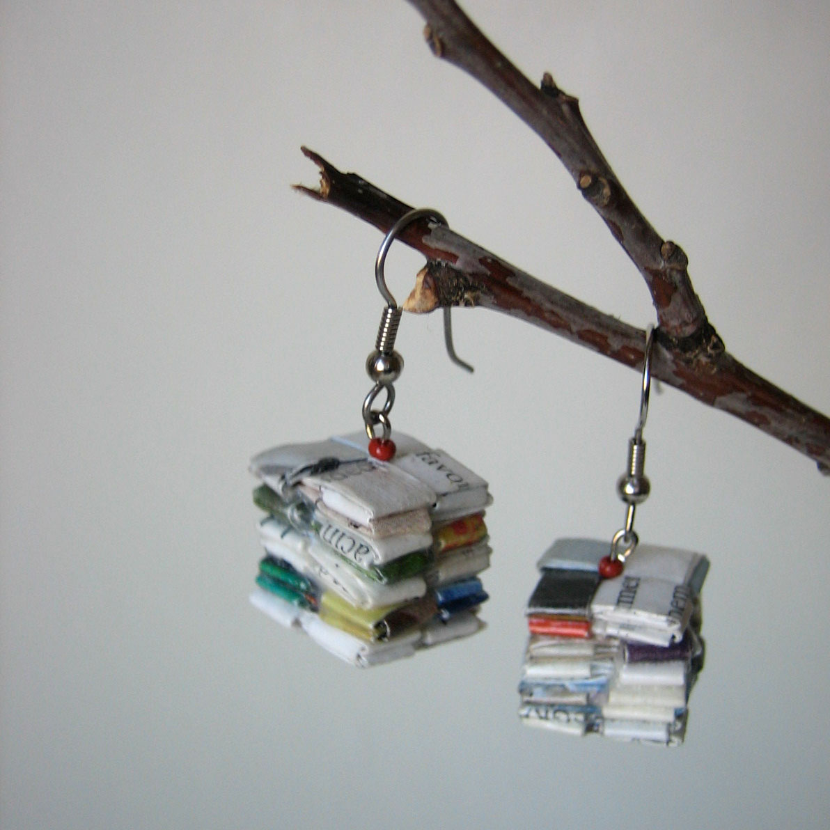 They look like a stack of books? Or magazines? These earrings are actually made from rescued junk mail.