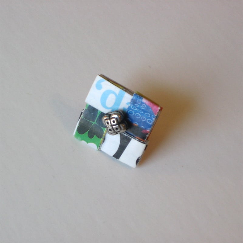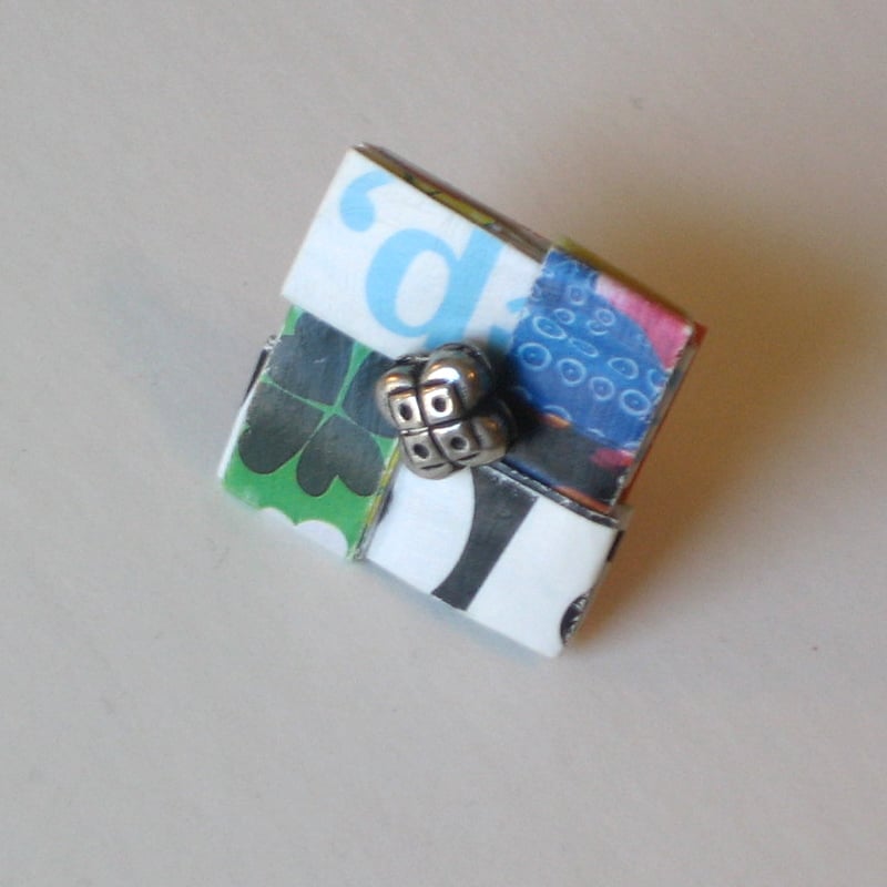 You can too -- let uninvited mail and magazines add a little extra pop of color to your next outfit. Hand-cut, hand-woven, recycled paper teams up to create this eco-chic pin.