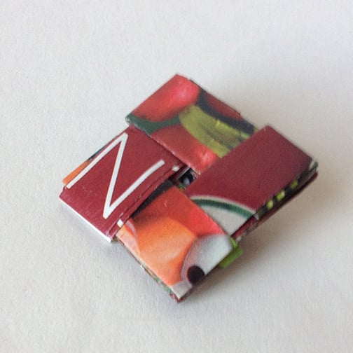 I made this paper brooch with the prettiest bits of rescued paper I could find. I carefully cut, folded and wove them together. Depending on how you wear it, it could be a letter "Z" or an "N".