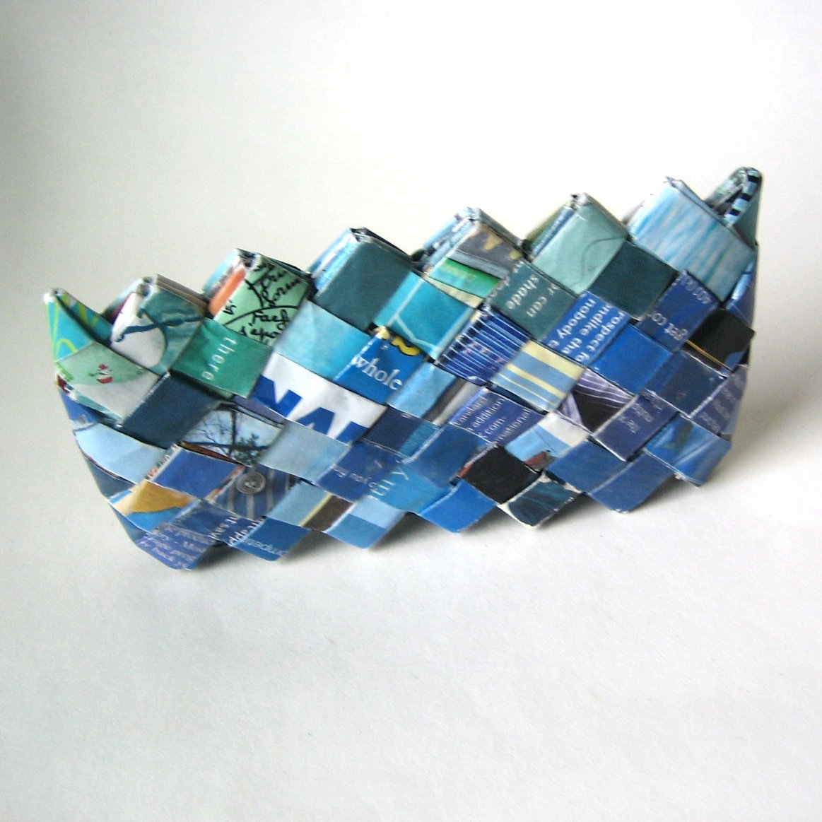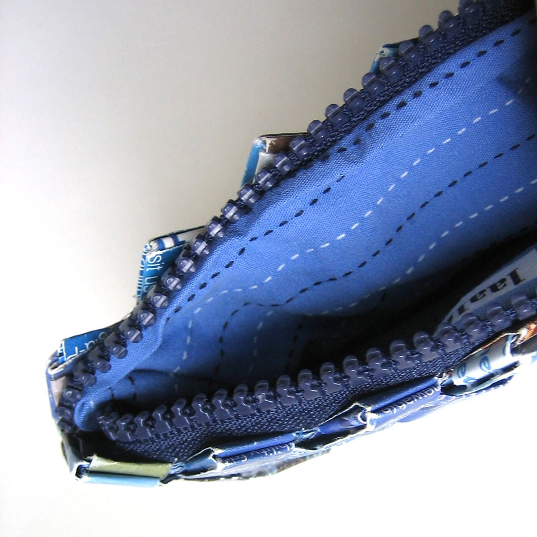 I've put all these blue bits of paper together to form a small pouch with a zipper. It's one of a kind -- I couldn't make another one exactly like it no matter how hard I tried.