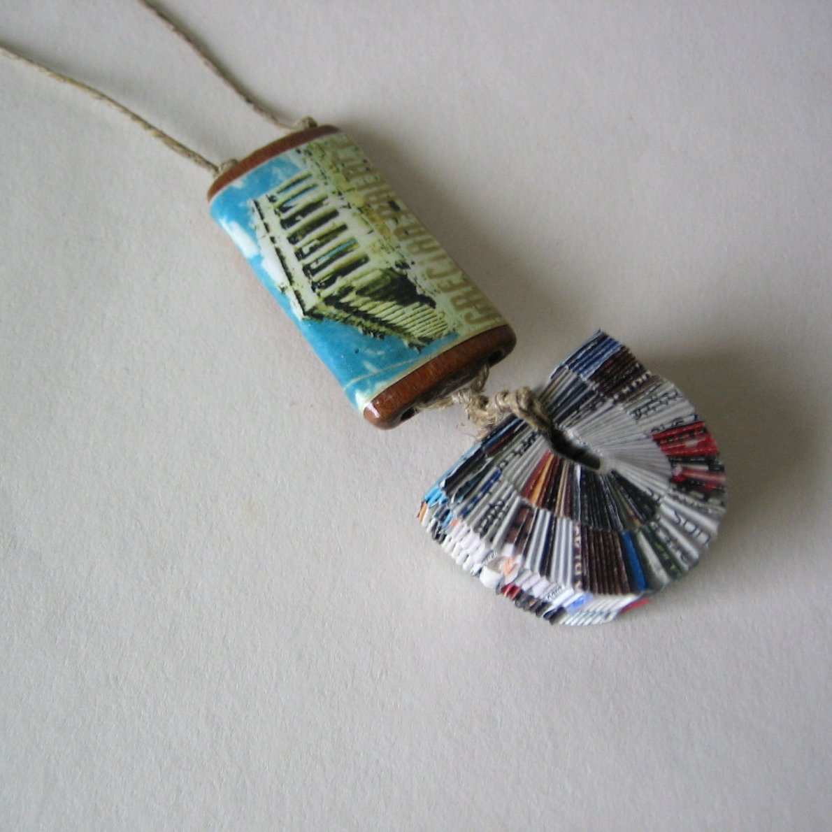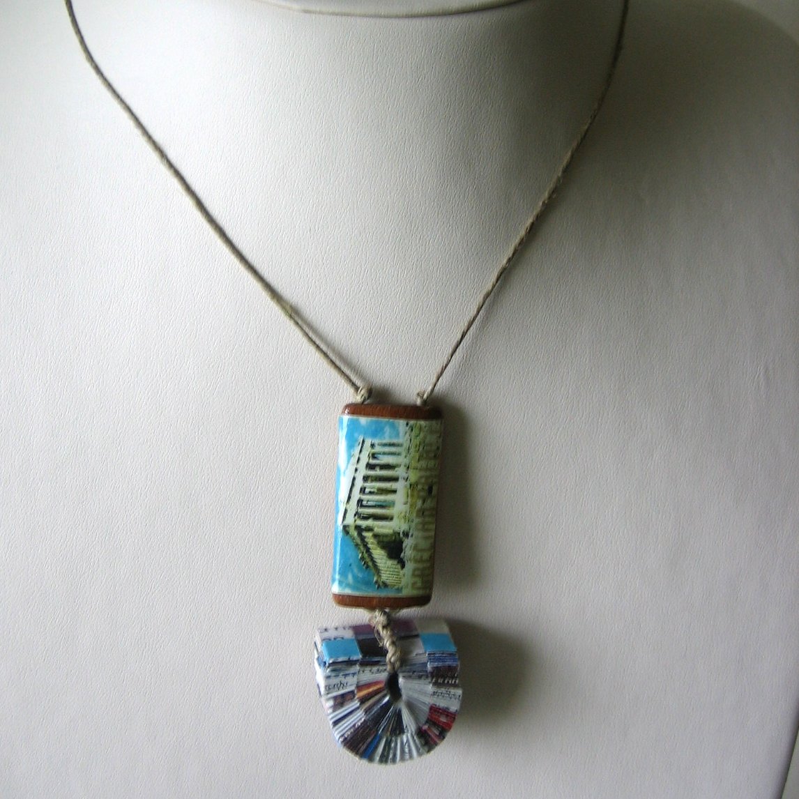 I created this lovely necklace with magazines, catalogs, junk mail and a bamboo bead. Enjoy wearing classical Greek architecture around your neck and you may just feel like a goddess.
