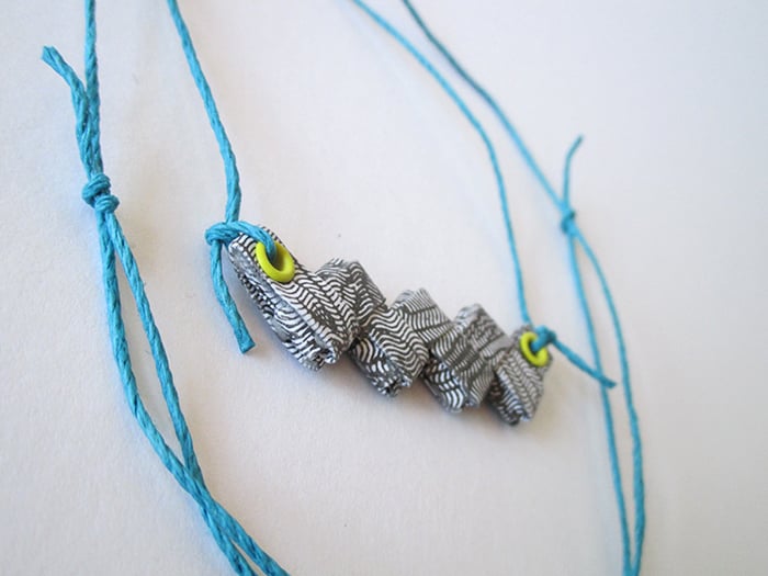 Teal and lime green have teamed up with black and white to grace your neck gracefully and eco consciously.