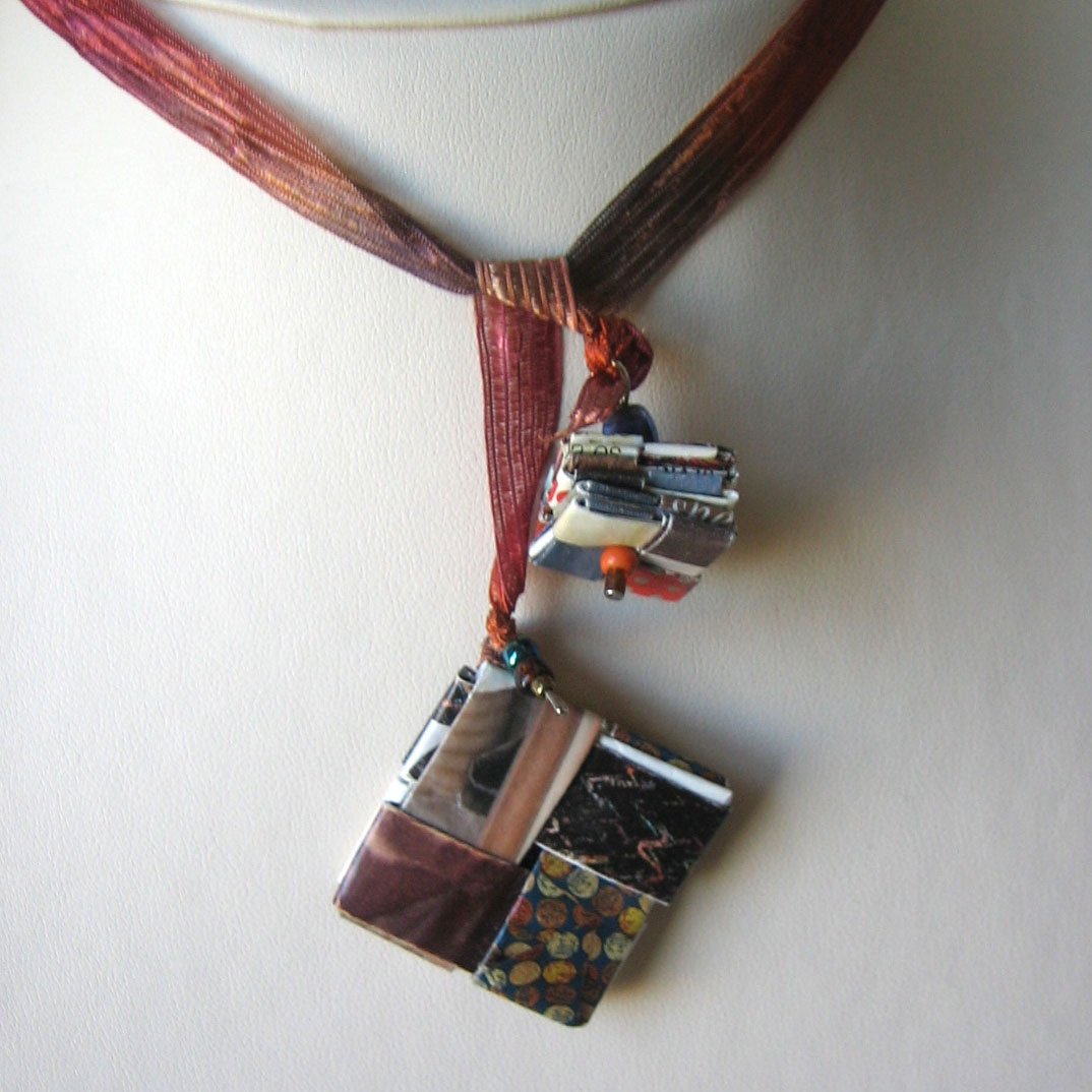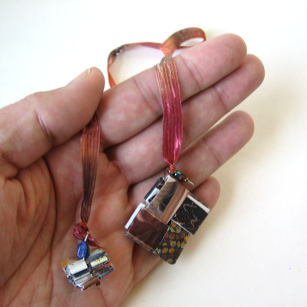I love the earthy yarn colors that compliment the earthy colors of the junkmail that I have carefully folded into two small pendants.