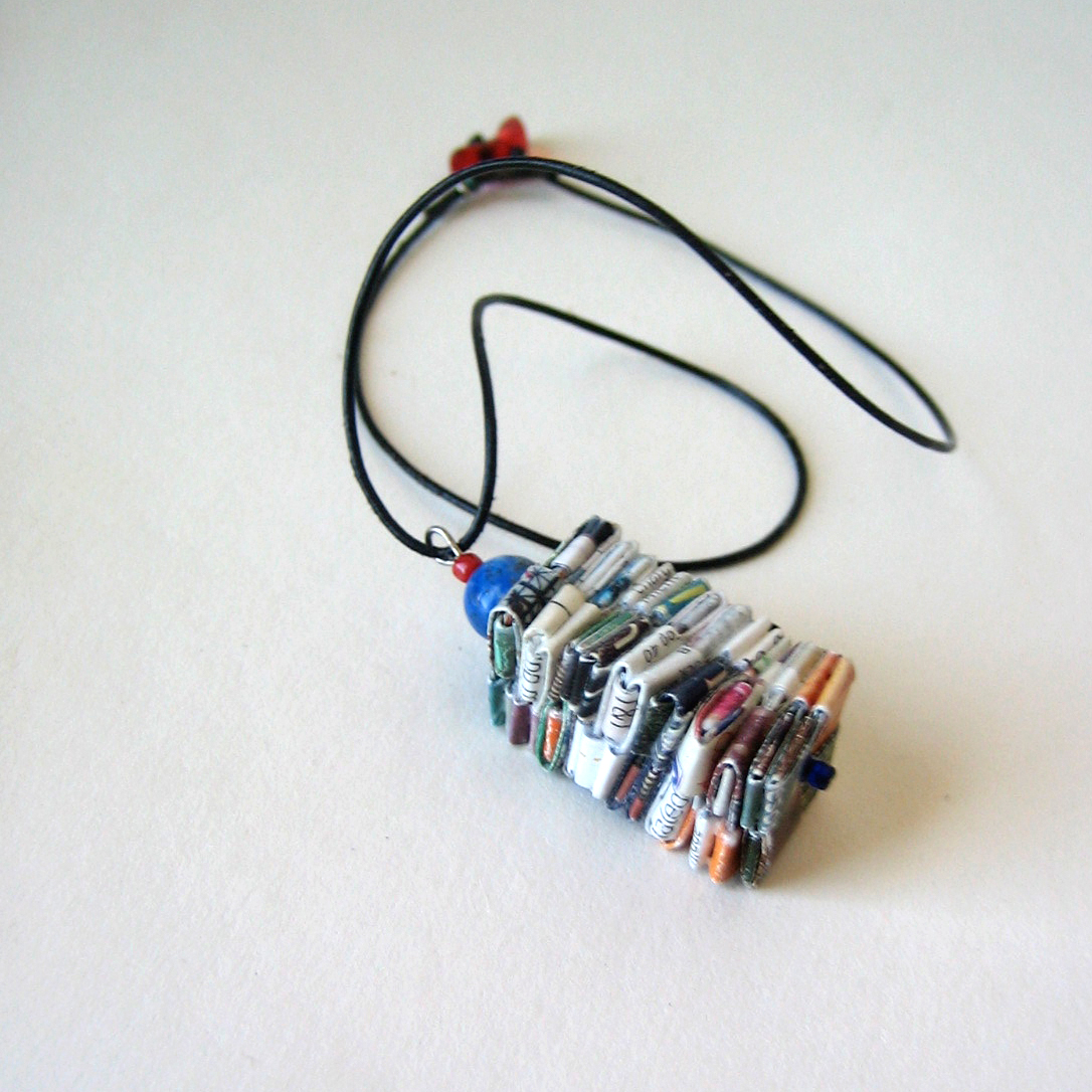 A tall stack of rescued paper dangles happily from a narrow black leather cord. A lapis bead crowns the stack.