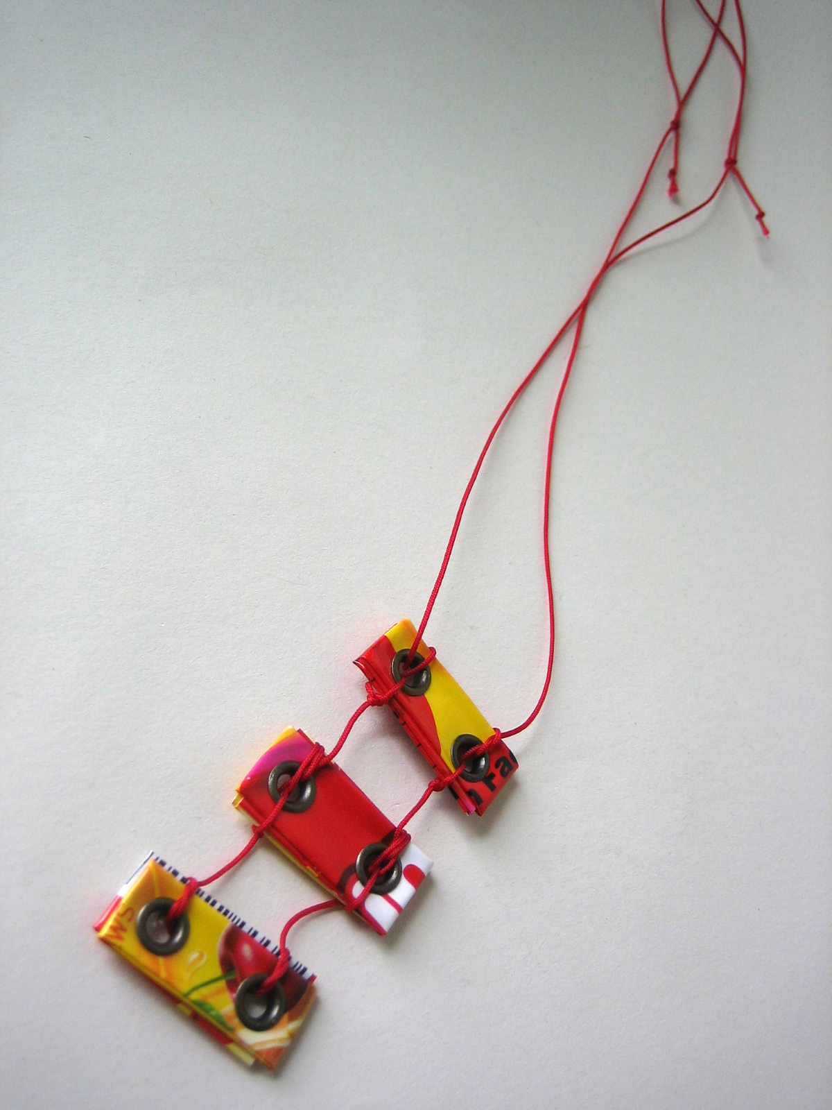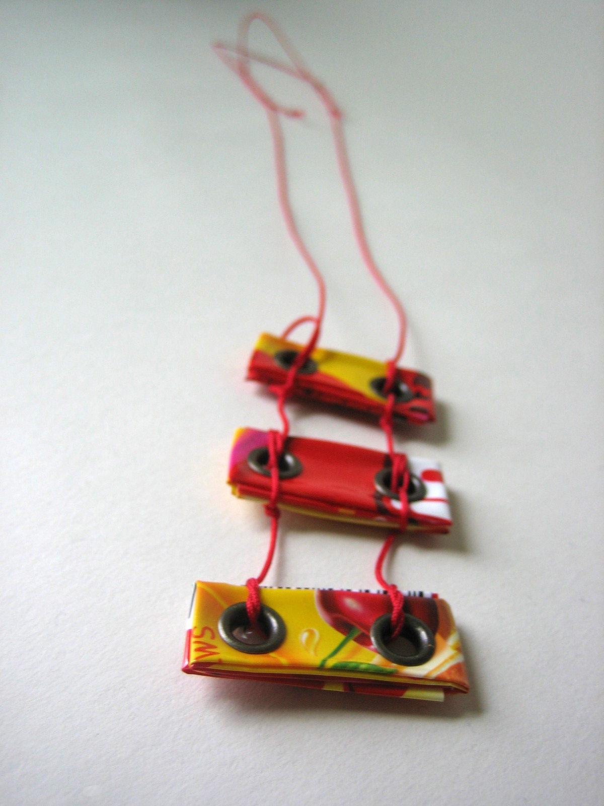 I made this necklace with rescued Starburst candy packages. It's a triad of colorful eco bars and grommets. They kind of look like stair steps or railroad ties. What do you see in them?
